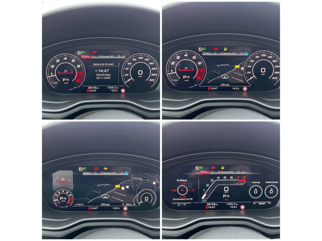 - Design-Paket: RS grau [Mittelkonsole seitlich in Alcantara, Fußmatten Audi exclusive mit Schriftzug und farbigem Kederprofil (Leder), Türarmlehnen beledert, Bedienelemente Alcantara]