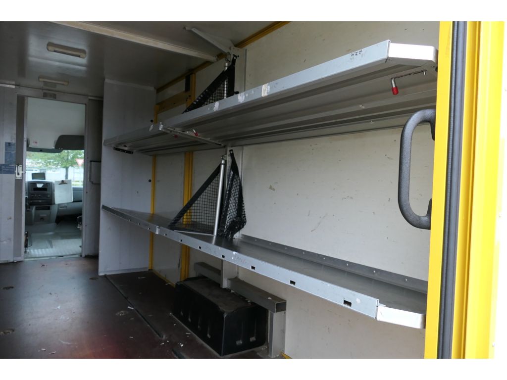 Der Laderaum ist professionell mit einem Regaleinbau ausgestattet, sodass Werkzeuge, Ersatzteile oder Material übersichtlich und griffbereit verstaut sind. Auch in diesem Zustand bietet der Sprinter eine solide Grundlage für Reparatur oder Umbau.