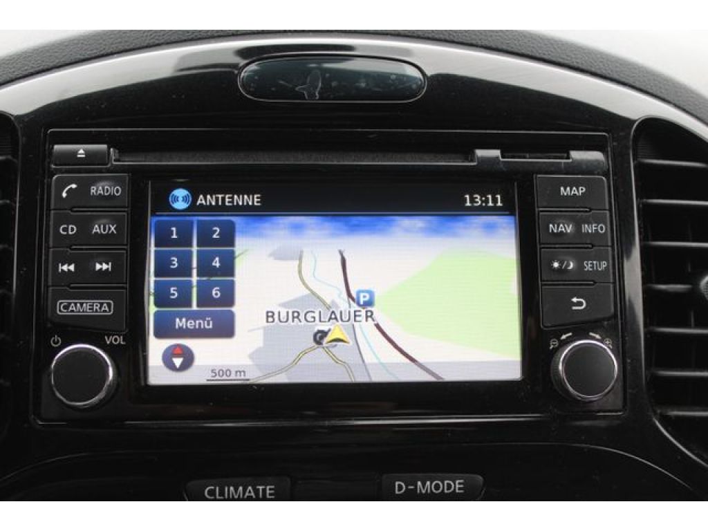 - 3. Bremsleuchte, Airbag Fahrer-/Beifahrerseite und Seitenairbag vorn, Around View Monitor (360° Umgebungsansicht), Audiobedienung am Lenkrad, Ausstattungs-Paket: Nissan Connect, Automatische Fahrlichtschaltung, AUX-IN-Anschluss (AUX-IN), Außenspiegel elektr. anklappbar, Außenspiegel elektr. verstell- und heizbar, Außenspiegel heizbar, Außenspiegel Wagenfarbe, Außentemperaturanzeige, Blinkleuchte in Außenspiegel integriert, Bordcomputer, Bremsassistent (Nissan Brake-Assist), Dachantenne, Dynamic-Control-System (Fahrprofilauswahl), Elektr. Bremskraftverteilung (EBD), Fensterheber elektrisch vorn + hinten, Freisprechanlage Bluetooth, Frontscheibe Verbundglas, Gepäckraumabdeckung / Rollo, Getränkehalter in Mittelkonsole, Gurtstraffer, Heckscheibe heizbar, Innenspiegel abblendbar, Isofix-Aufnahmen für Kindersitz, Karosserie: 5-türig, Kindersicherung, Klimaautomatik, Kopfstützen hinten, Kopfstützen vorn verstellbar, Lenksäule (Lenkrad) höhenverstellbar, Leseleuchte vorn, LM-Felgen, Motor 1,6 Ltr. - 86 kW 16V KAT, Nebelschlussleuchte, Radstand 2530 mm, Reifen-Reparaturset, Rücksitz geteilt/klappbar, Schadstoffarm nach Abgasnorm Euro 5, Scheibenwischer mit Intervallschaltung, Sicherheitsgurte vorn höhenverstellbar, Sitz vorn links höhenverstellbar, Sonnenblenden mit Spiegel, Sport-Paket, Start-Stop-Knopf, Steckdose (12V-Anschluß) in Mittelkonsole, Türgriffe innen verchromt, Wärmeschutzverglasung mit UV-Schutz