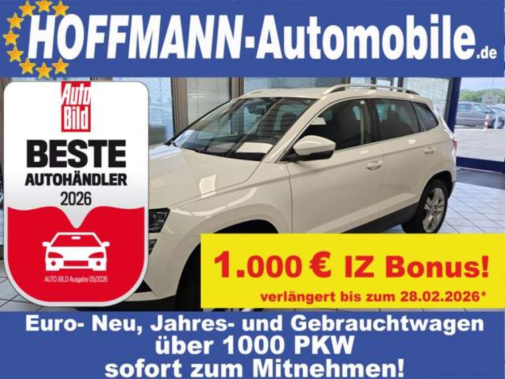 Inzahlungnahme-Bonus Erhalten Sie 1000€ zusätzlich für Ihren gebrauchten Pkw bei Ankauf von uns, verlängert bis zum 28.02.2026. Repräsentatives Finanzierungsbeispiel Anzahlung: 4.180,00 € Nettodarlehen: 18.623,65 € 35 Monatsraten: 276,11 € Schlussrate: 11.495,00 € Gesamtdarlehensbetrag: 21.158,77 € Laufzeit Gesamt: 36 Monate effektiver Jahreszins: 5,99 % Gebundener Sollzins: 5,97 % Bearbeitungsgebühren: 0,00 €Vorstehende Angaben stellen zugleich das 2/3-Beispiel gem. 6a Abs. 3 PAngV dar. Bonität vorausgesetzt. Nettodarlehensbetrag ist inklusive einer auf Kundenwunsch mitfinanzierten Ratenschutz-, Arbeitslosen- und Kaufpreisversicherung. Ihre Wunschfinanzierung maßgeschneidert zu günstigen Konditionen - auch ohne Anzahlung, ohne lange Wartezeiten und zusätzliche Bankwege, über eine unserer Partnerbanken. Erlebe Freiheit und Komfort neu - Der Škoda Karoq Style Stell dir einen sonnigen Samstagmorgen vor. Die Welt erwacht, der Duft von frischem Kaffee liegt in der Luft. Du hast die Freiheit, genau das zu tun, wonach dir der Sinn steht – mit voller Kraft und jedem denkbaren Komfort. Der Škoda Karoq Style lässt diese Vorstellung zur Wirklichkeit werden. Der Entdeckergeist im Karoq Beginne deine Reise mit einem Gefühl der grenzenlosen Möglichkeiten. Der Škoda Karoq ist kein gewöhnlicher Geländewagen – er ist dein Partner für Entdeckungen, dein Tor zur Welt jenseits des Alltags. Sein 1,5-Liter-Motor mit 150 PS zieht kraftvoll an, und die 6-Gang-Schaltung sorgt für ein dynamisches Fahrgefühl, das dir erlaubt, mit Leichtigkeit über die Straßen zu gleiten. Funktionalität trifft Eleganz In strahlendem Candyweiß zieht der Karoq die Blicke auf sich, während sein robustes Design mit silberner Dachreling seine Abenteuerlust unterstreicht. Elektrische Außenspiegel, die bei Bedarf beheizbar und einklappbar sind, sowie die praktische elektrische Heckklappe machen jeden Ausflug zum Kinderspiel. Die Sommerreifen auf stilvollen 17-Zoll-Alufelgen sorgen für eine ruhige Fahrt, ganz gleich, wohin es geht. Ein Innenraum voller Möglichkeiten Komm zur Ruhe, während du die zweizonige Klimaautomatik genießt und in die weichen, beheizbaren Vordersitze sinkst, die dich auch an kalten Tagen warmhalten. Alles ist darauf ausgerichtet, dir das Autofahren so angenehm wie möglich zu gestalten. Das multifunktionale Lederlenkrad, in Verbindung mit den intelligenten Assistenzsystemen wie der Müdigkeitserkennung und der automatischen Distanzregelung, gibt dir jederzeit das Gefühl absoluter Kontrolle und Sicherheit. Innovative Technologie für deine Fahrt Die nahtlose Integration von Technologie ist das Herzstück des Škoda Karoq. Mit dem modernen Navigationssystem und der Bluetooth-Schnittstelle bleibst du auch unterwegs immer verbunden. Schalte deine Lieblingsmusik über die DAB-Radio-App-Connect ein und steuere alles bequem über den intuitiven Touchscreen. Sichere Telefonate mit der Freisprechanlage sind ein zusätzlicher Vorteil auf jeder Strecke. Sicherheit und Vertrauen Die umfangreiche Sicherheitsausstattung des Karoq bringt dir ruhige Gelassenheit. Front-, Seiten- und weitere Airbags stehen neben ABS, ESP und einer präzisen Einparkhilfe mit Kamera bereit, um sicherzustellen, dass du und deine Lieben auf jedem Kilometer geschützt sind. Vielseitigkeit und Raum Ob Wochenendeinkauf, Familienausflug oder spontaner Roadtrip – mit einer Anhängelast von bis zu 1.500 kg nimmst du alles mit, was du brauchst. Die geteilte Rückbank mit Durchladeeinrichtung bietet Flexibilität ohne Kompromisse. Mach den ersten Schritt in ein neues Abenteuer Alle diese hochwertigen Merkmale kommen zu einem unübertroffenen Preis von nur 20.900 Euro bei einer Laufleistung von lediglich 69.036 Kilometern. Der Škoda Karoq Style ist bereit, dir die Freiheit zu schenken, dein Leben nach deinen Wünschen zu gestalten. Steige ein, genieße die Fahrt und entdecke die Welt auf deine eigene Art. Worauf wartest du noch? Dein Karoq-Abenteuer beginnt jetzt.Wunschgemäss können Sie einen DEKRA-Zustandsbericht mit DEKRA-Siegel erhalten. We speak english, Hablamos español, Nous parlons français, Parliamo italiano, Mówimy po polsku, Mes kalbame lietuviskai, Noi vorbim romaneste. Zugriff auf über 5000 Werks- und Jahreswagen von Mercedes - sofort lieferbar! HOFFMANN-Automobile.de mit über 1000 EU-Neuwagen, Jahreswagen und Gebrauchtwagen - sofort zum Mitnehmen! Firmenvideo : http://www.youtube.com/watch?v=4Sfh00LtX4g ²Ersparnis zur unverbindlichen Preisempfehlung des Herstellers zum Inlandsmodell.